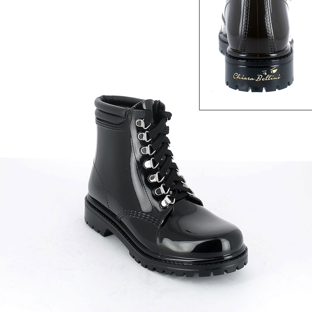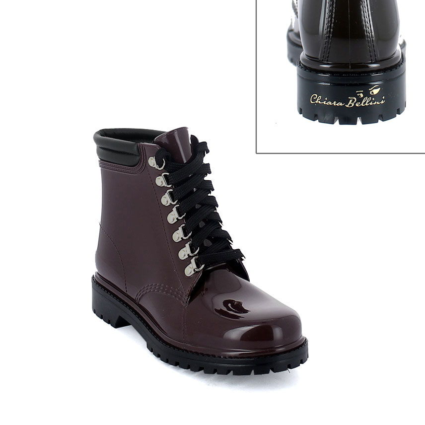 Short laced up walking boot in Sanguinaccio pvc with leatherette padded trim. New 3D logo.