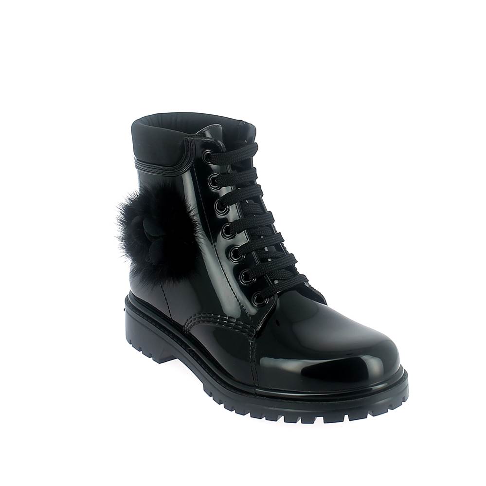 SHORT LACED UP WALKING BOOT IN PVC WITH PON-PON FLOWER. BLACK