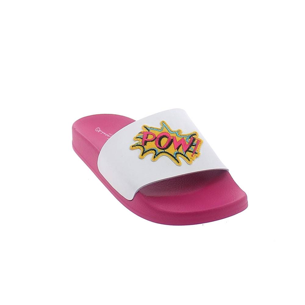 SUMMER MULE IN WHITE-FUXIA COLOUR WITH LEATHERETTE BAND UPPER AND "POW" PATCH