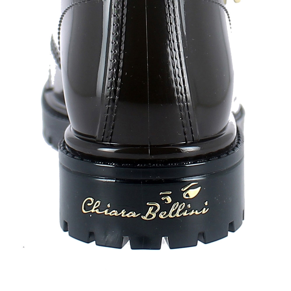 Stivaletto modello anfibio in pvc con borchie stelle in metallo color oro. L'anfibio dal look aggressivo è realizzato con pvc dalla finitura lucida. Sul gambale sono state applicate 3 borchie in metallo oro a forma di stella. Sul retro del tacco viene applicato il logo ufficiale in gomma con effetto 3D color oro. All’interno dell’anfibio in pvc è inserito un morbido sottopiede. Colore: Testa di moro Misure disponibili: 35-41