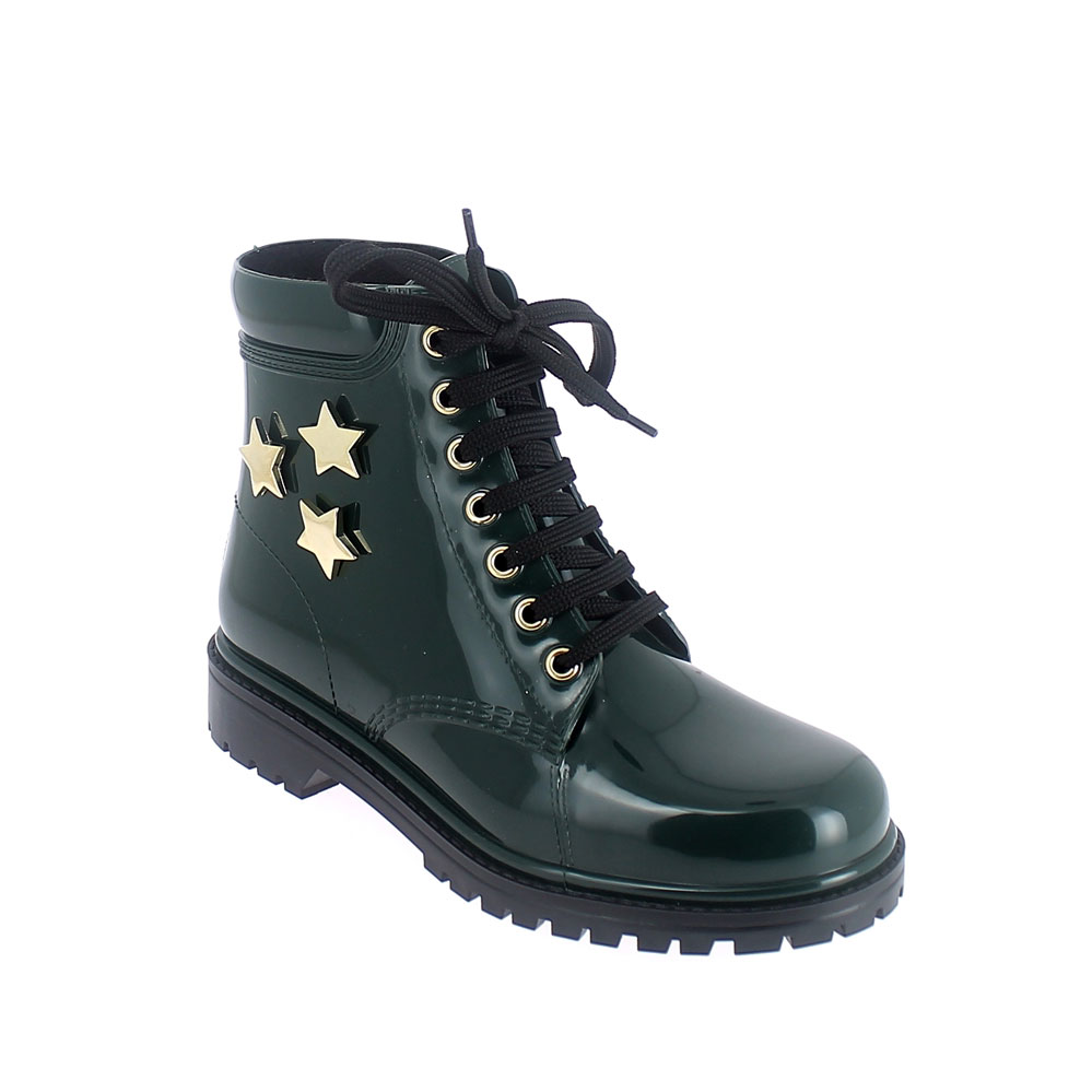 Stivaletto modello anfibio in pvc con borchie stelle in metallo color oro. L'anfibio dal look aggressivo è realizzato con pvc dalla finitura lucida. Sul gambale sono state applicate 3 borchie in metallo oro a forma di stella. Sul retro del tacco viene applicato il logo ufficiale in gomma con effetto 3D color oro. All’interno dell’anfibio in pvc è inserito un morbido sottopiede. Colore: Verde pino Misure disponibili: 35-41