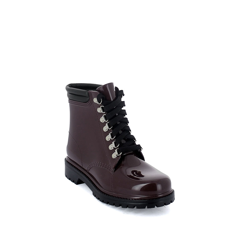 Anfibio modello pedula con bordino imbottito e ganci passalaccio. L'anfibio-pedula in pvc presenta un morbido bordino in ecopelle nera alla caviglia ed è completato con ganci passalaccio in metallo color canna di fucile. All’interno dell’anfibio in pvc viene inserito un morbido sottopiede. Sul retro del tacco viene applicato il logo ufficiale in gomma con effetto 3D. Colore: Sanguinaccio Misure disponibili: 35-41