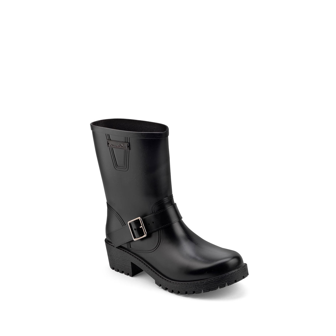Chiara Bellini propone un nuovo modello di Stivaletto Chelsea in Pvc bicolore con applicazione di strass nell’elastico laterale.