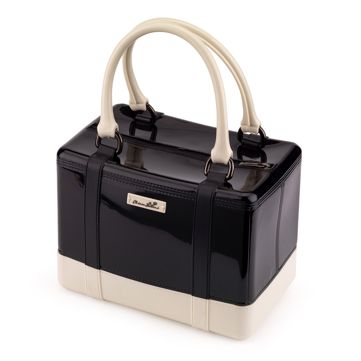 Borsa a bauletto in pcv bicolore bianco nero (colorazione nero trench). La borsa modello bauletto presenta manici pvc, etichetta Chiara Bellini e fondo di colore bianco.