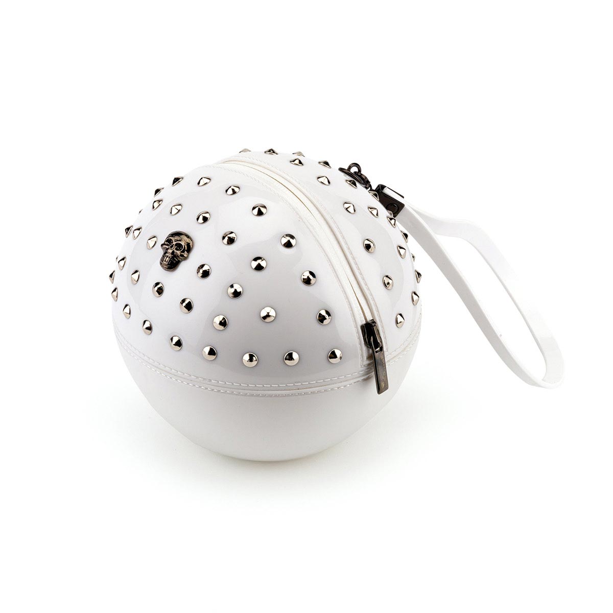 Borsa a sfera in Pvc bianco modello Rock'n Ball con borchie e teschio applicate. La borsa presenta una maniglia in pvc.