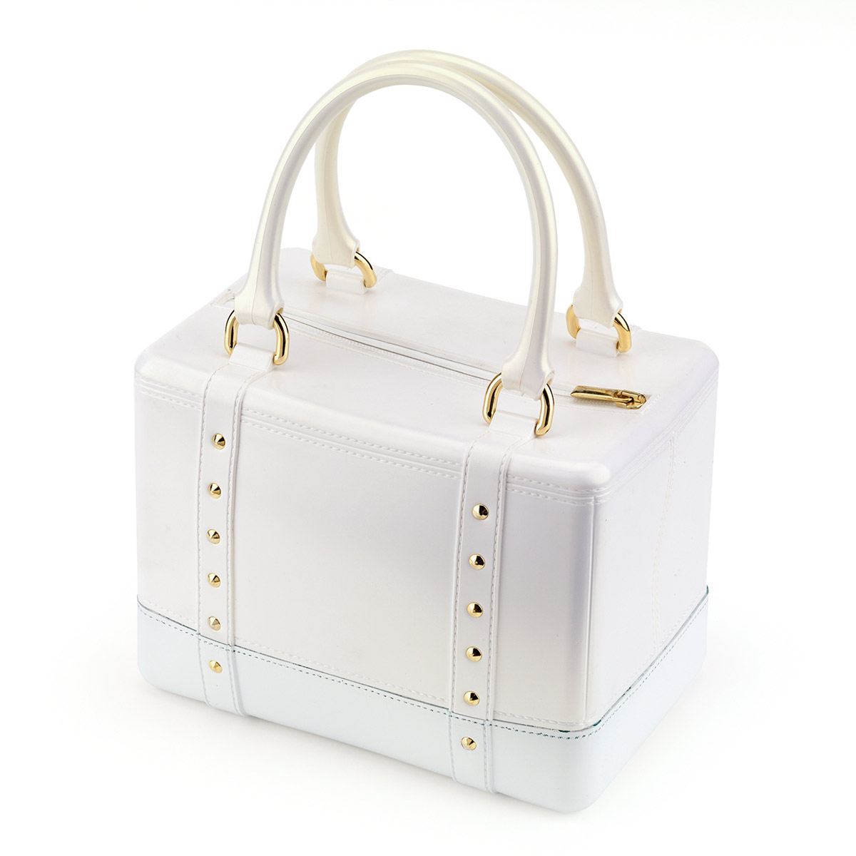 Borsa a bauletto in Pvc bianco con borchie oro e dettagli oro.