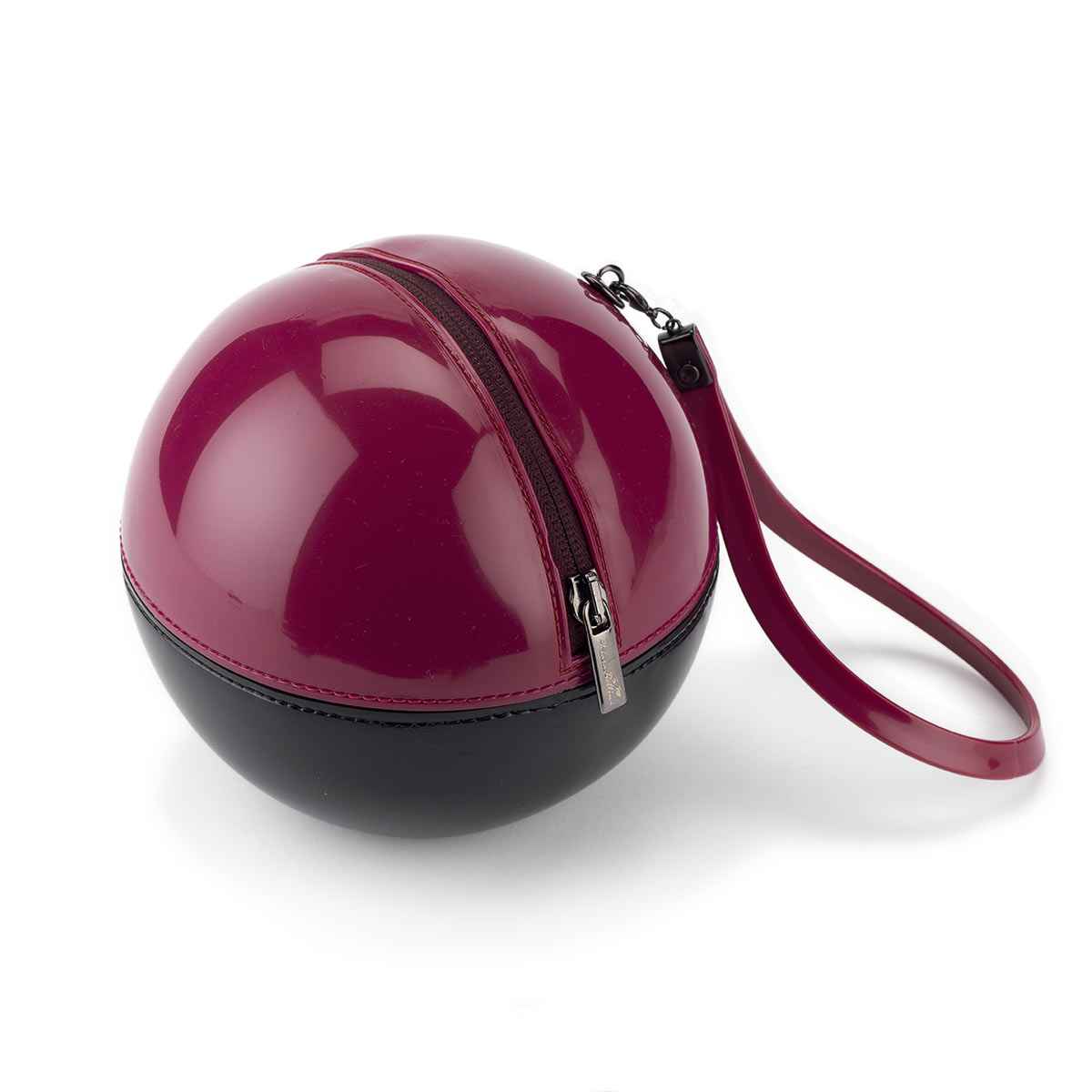 Borsa sfera “Rock’n’Ball” bicolore nero/ciliegia (colorazione cherry) in pvc effetto lucido con manico in pvc e targhetta in gomma. Sulla parte terminale dell’apertura a zip è applicata una targhetta con logo, in gomma. Tutti i dettagli sono in metallo lucido colore argento scuro. Il cursore della zip presenta anch’esso una sottile incisione del logo.