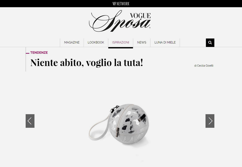 La borsa a sfera in Pvc Rock’n’Ball con lamina bianco e argento compare sul sito di Vogue Sposa!