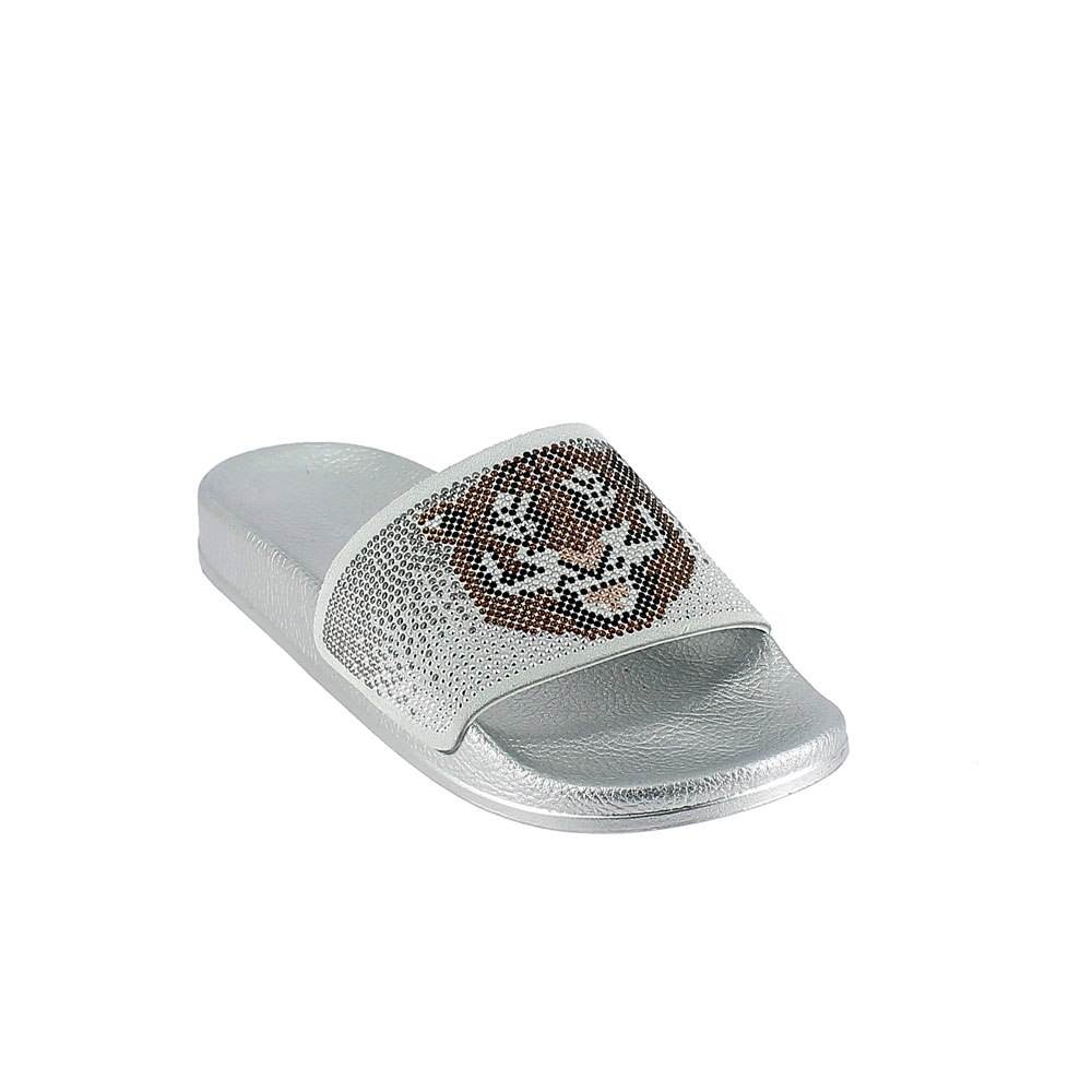 CIABATTA IN PELLE CON STRASS TIGRE. ARGENTO