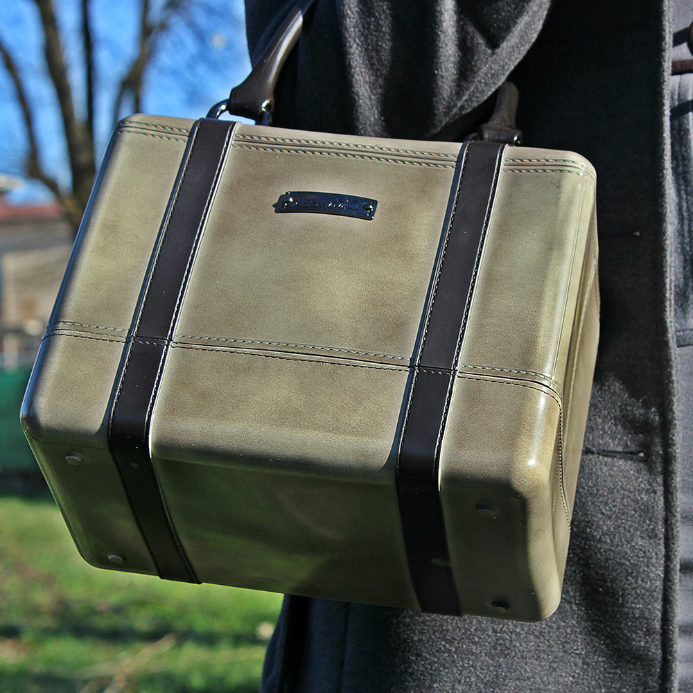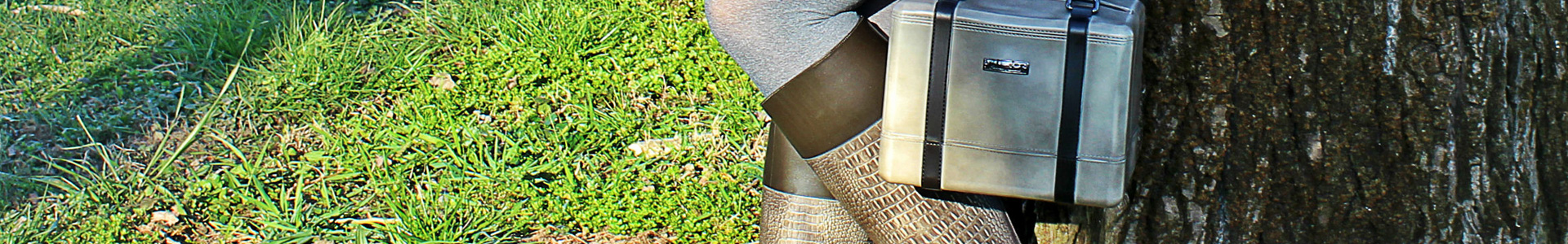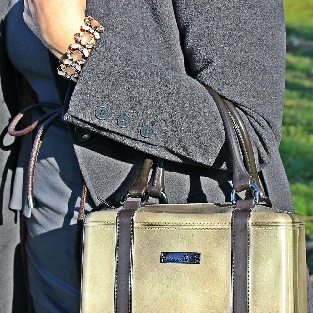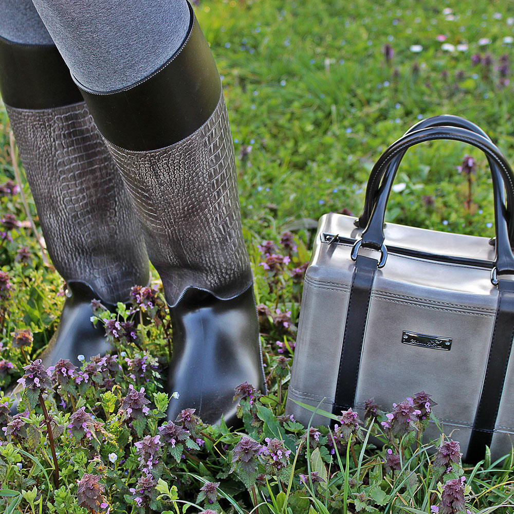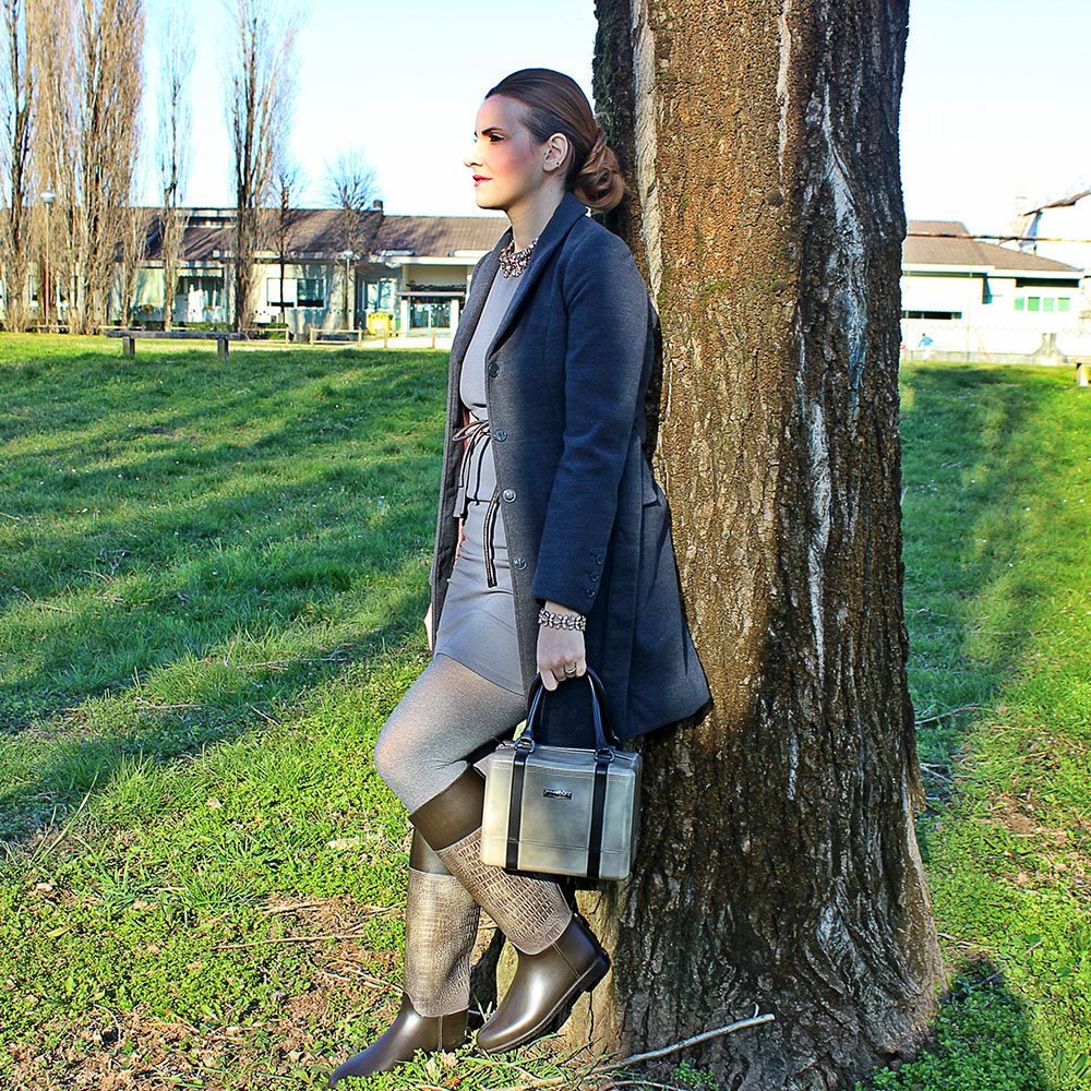 Nel suo blog elisabettabertolini.com la vedete indossare lo stivale cavallerizzo con stampa coccodrillo color taupe e la borsa bauletto abbinata sempre color taupe e dall'effetto spazzolato.