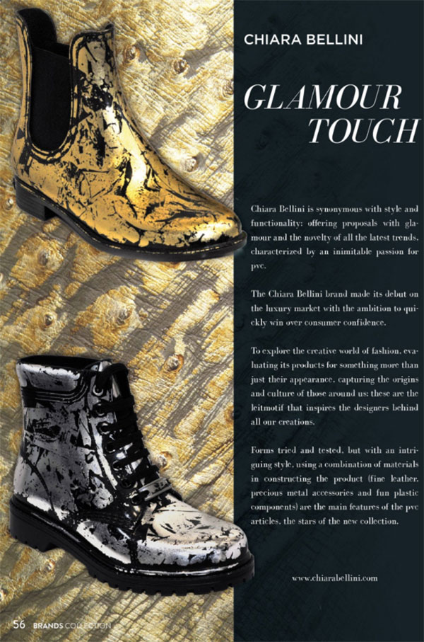 Brands Collection, magazine dedicato alla moda internazionale, dedica la pagina 56 del numero di Marzo 2016 al brand Chiara Bellini, selezionando le immagini degli stivaletti Chelsea e degli anfibi in Pvc effetto laminato.