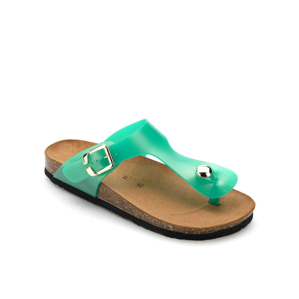 La colorazione dell’infradito è smeraldo con cangiatura di colore oro.