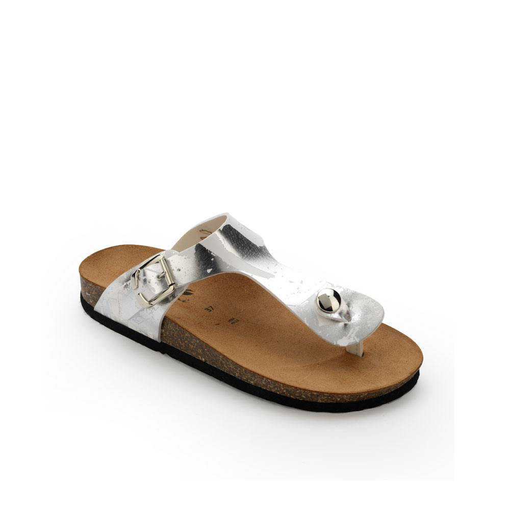 Infradito in pvc laminato con zeppa bassa in sughero.