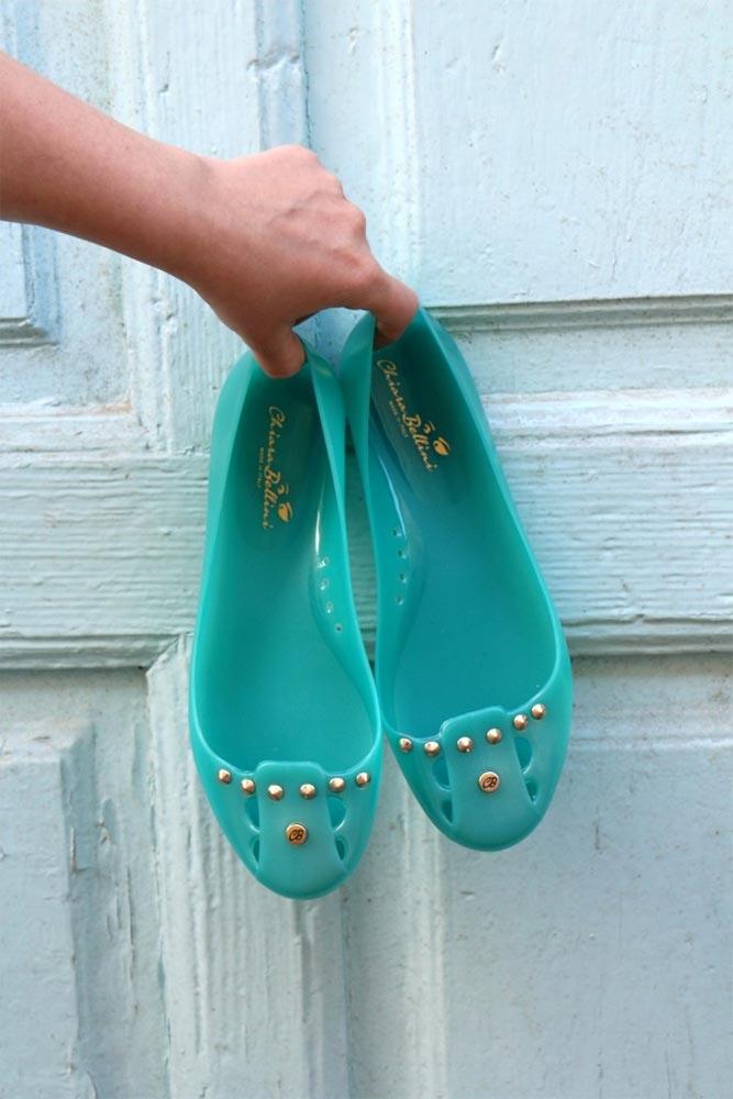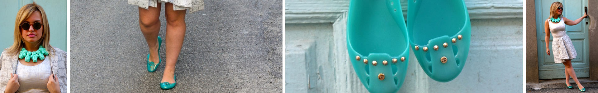 L'outfit moda gioca sui colori estivi e luminosi del ghiaccio e del verde menta, attraverso l’abbinamento della collana con le ballerine in Pvc effetto cangiante oro. Lo stile di questo outfit è sensuale e raffinato e viene valorizzato dai colori e dallo stile della ballerina verde menta in Pvc che Carolina abbina alla collana che indossa, giocando con i colori e le forme degli accessori.