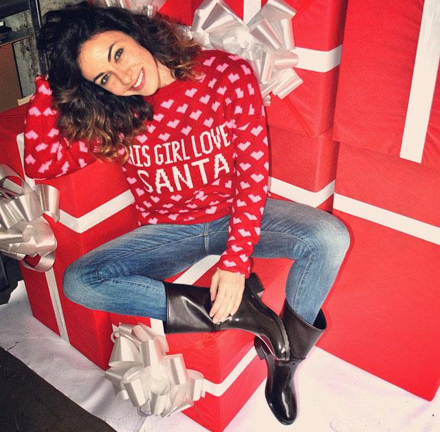 Il primo outfit creato da Melita si ispira alle festività natalizie ormai alle porte e si compone di un maglioncino caldo di colore rosso dal mood natalizio, un paio di jeans, e gli stivali antipioggia in Pvc firmati Chiara Bellini.