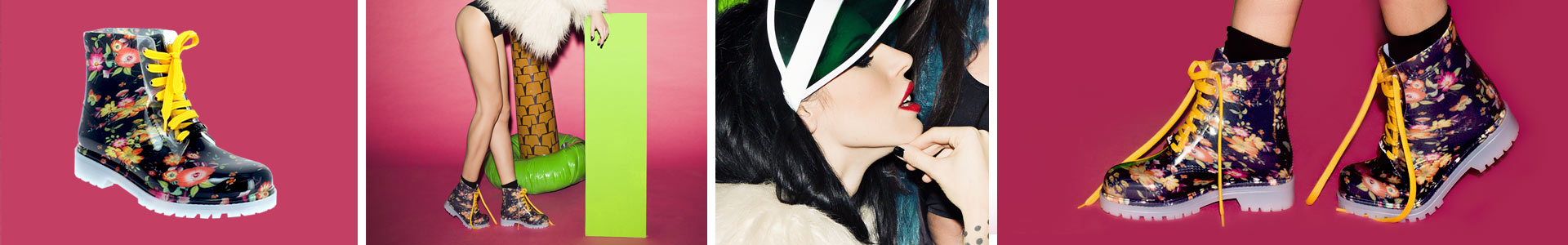All’interno dello Shop Online potrete acquistare il nuovo modello di Stivaletto anfibio in Pvc di colore nero con fantasia a fiori.