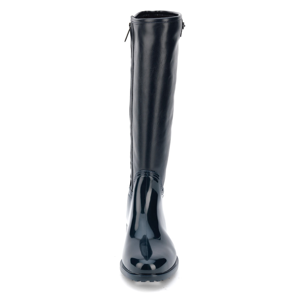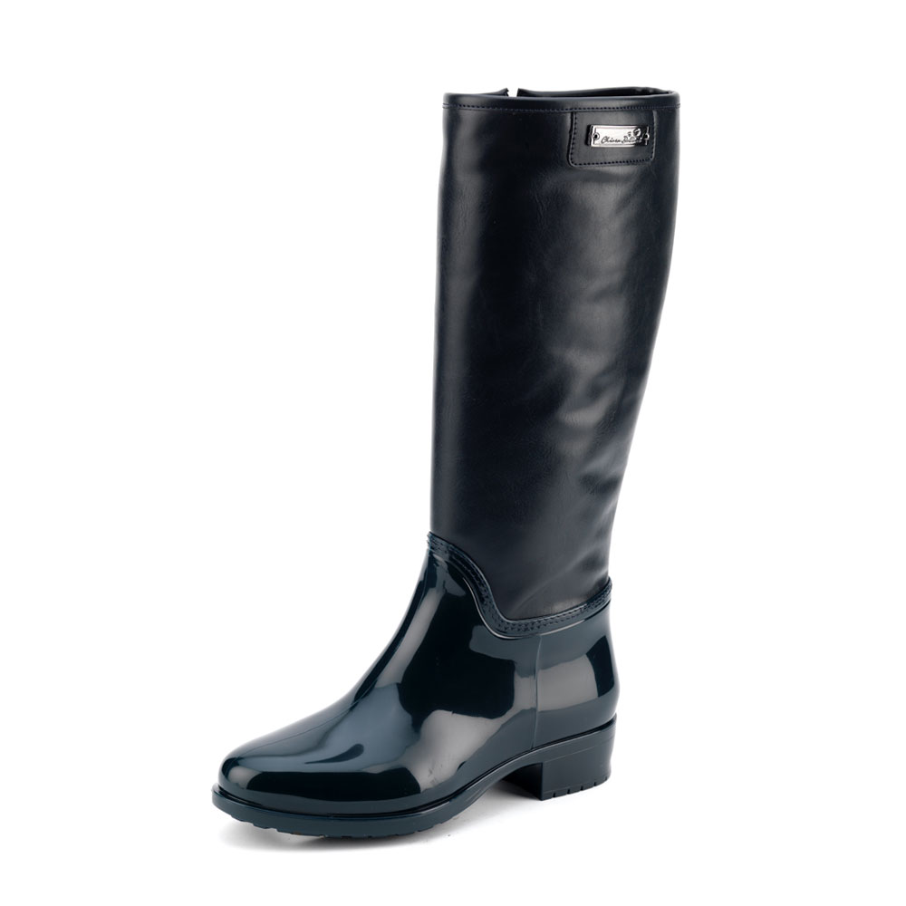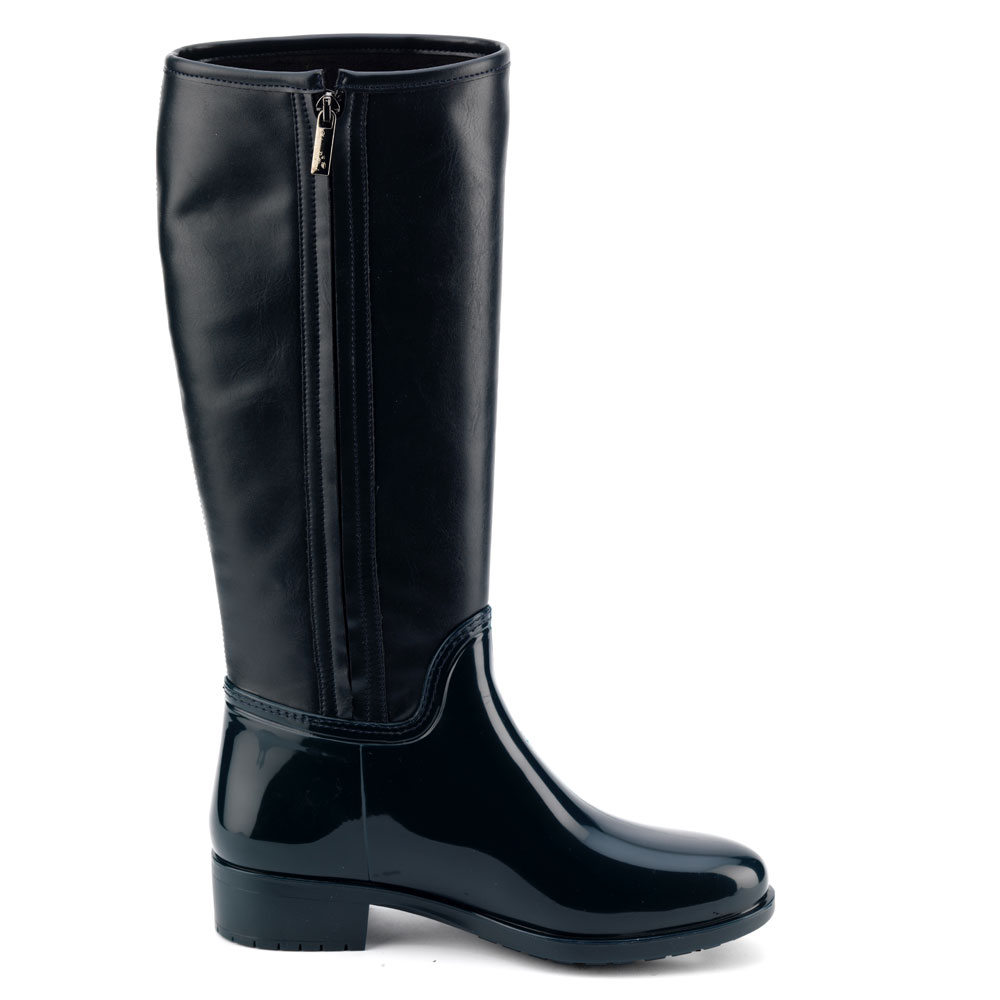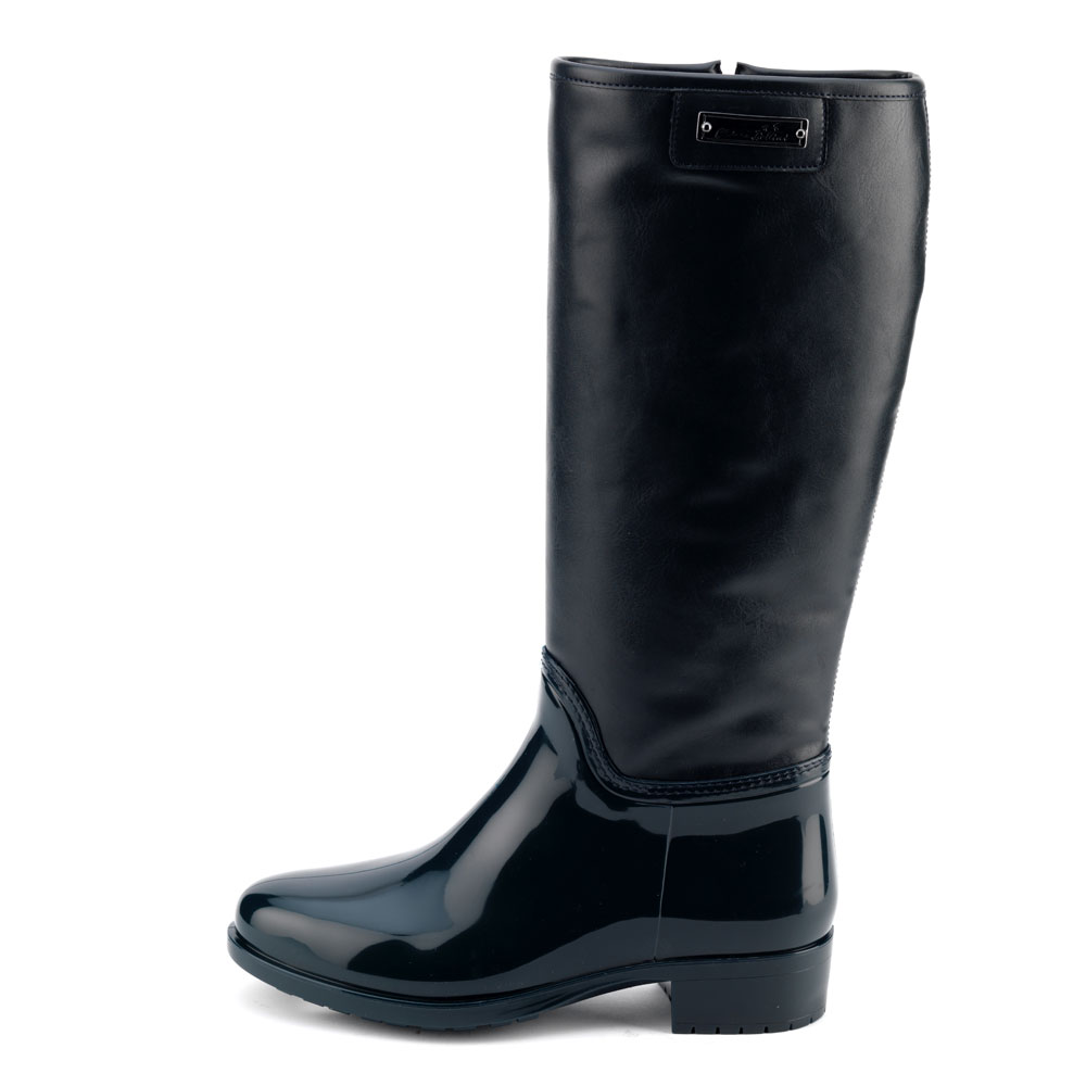 Stivale con scafo in pvc e morbido gambale alto in finta pelle, interamente foderato, adatto per le stagioni più fredde. Allo scafo dello stivale in pvc viene applicato un morbido gambale in finta pelle. Sulla fascia superiore è applicata una placca lucida in metallo con l’incisione del marchio. Sul lato interno dello stivale, lungo tutto il gambale, è cucita una lunga cerniera che facilita la calzata. Lo stivale è completamente foderato al suo interno: la parte del gambale con una morbida e sottile lana sintetica rasata di colore nero, la parte del piede invece con una calda lana sintetica più consistente per isolare meglio il piede dal freddo. La colorazione  dello stivale è “Blu”.