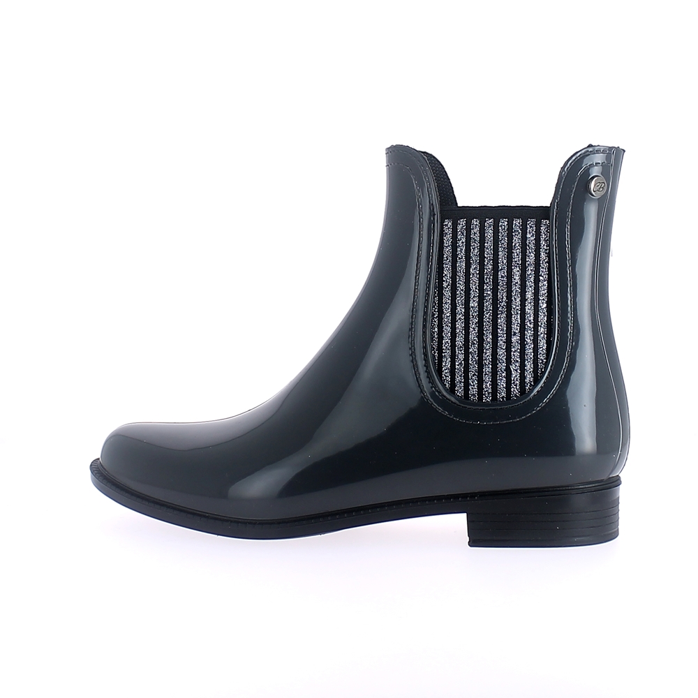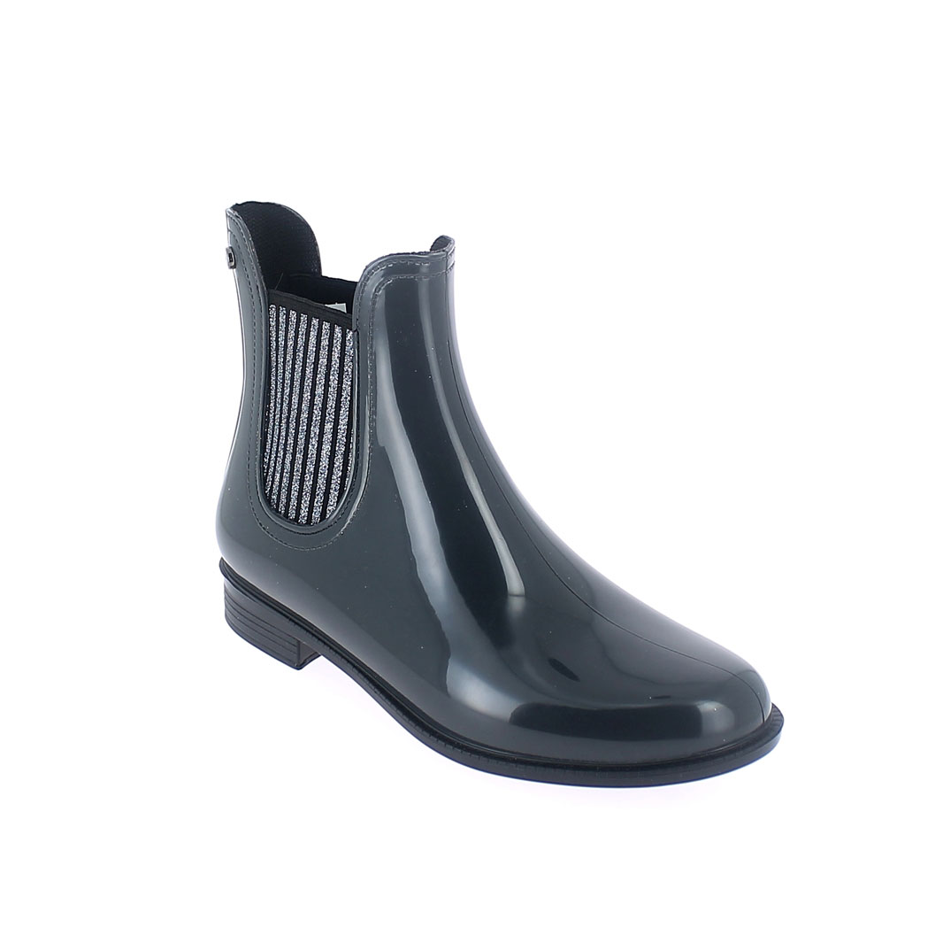 Stivaletto in pvc modello chelsea con elastico strisce glitter e borchia laterale in metallo con logo. Colore: Grigio fumo Misure disponibili: 35 - 41.