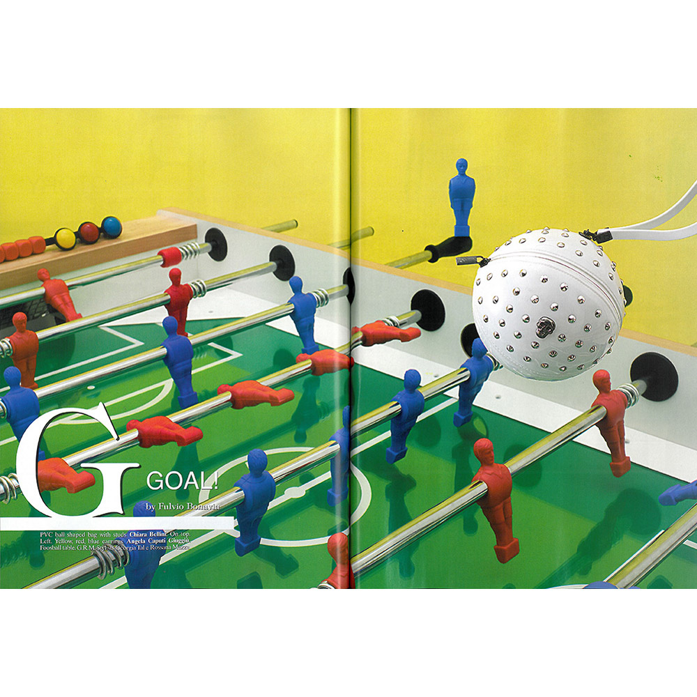 Nelle pagine della nota rivista di moda appare infatti lo scatto raffigurante la Borsa a Sfera “Rock’n’ball” in Pvc Lucido di colore bianco, con teschio e borchie di metallo applicate, adagiata su un tavolo da Calcio Ballilla, e due articoli redazionali dedicati rispettivamente al colore bianco e verde.