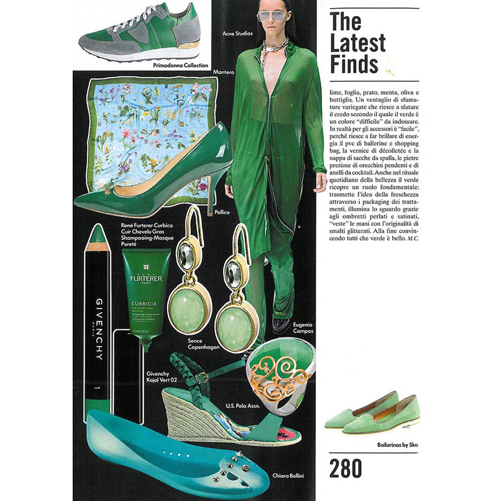 Nel redazionale dedicato al colore bianco è nuovamente presentata la borsa a sfera in Pvc lucido modello Rock’n’Ball con borchie applicate presentata sopra, viceversa nell’articolo dedicato al colore verde appare invece la nuovissima Ballerina in Pvc Effetto Cangiante con Borchie dorate.