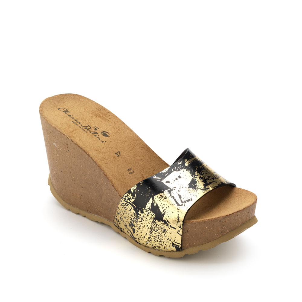 Tomaia fascia in pvc dall’effetto laminato, suola zeppa alta in sughero e sottopiede in vera pelle scamosciata..
